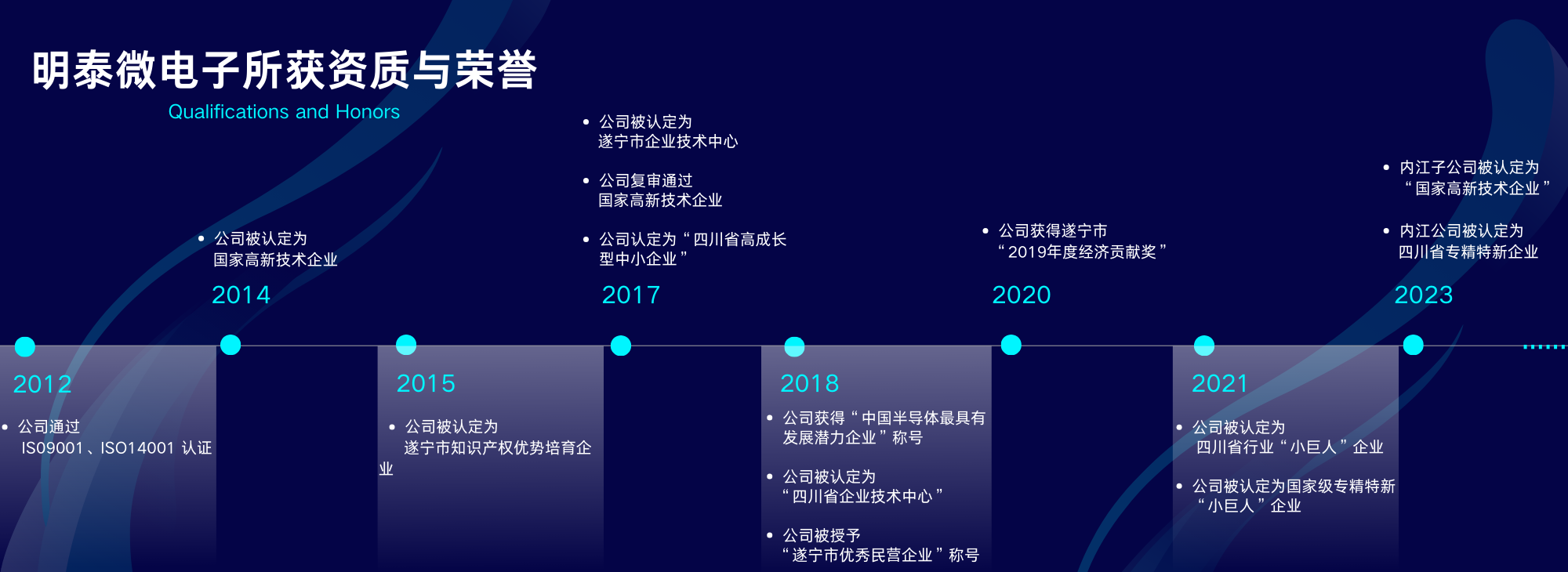 四川明泰電子科技有限公司獲得的資質和榮譽 ?2012年,公司通過ISO9001和ISO14001認證; 2014年,公司認定為“國家高新技術企業”; 2015年,公司認定為“遂寧市知識產權優勢培育企業”;